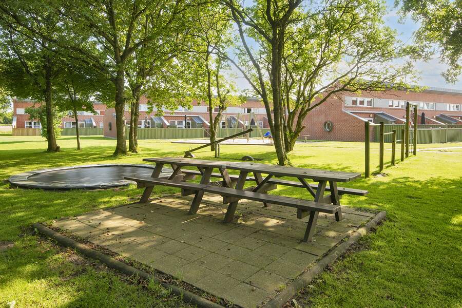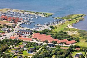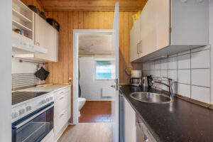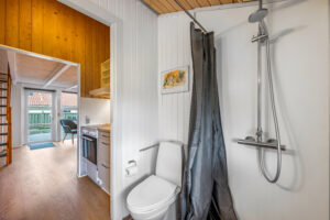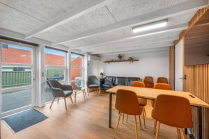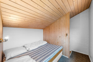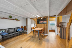 Lyse opholdsrum med store vinduespartier og direkte udgang til privat terrasse. Funktionelt køkken og spiseplads samlet i ét åbent rum, hvor ferien leves sammen. Soveværelser med varme trævægge og rolig atmosfære, der indbyder til afslapning. Praktisk badeværelse og en hyggelig hems med ekstra sovepladser. Udenfor venter solrig terrasse og grønne fællesarealer få skridt fra havn og fjord.