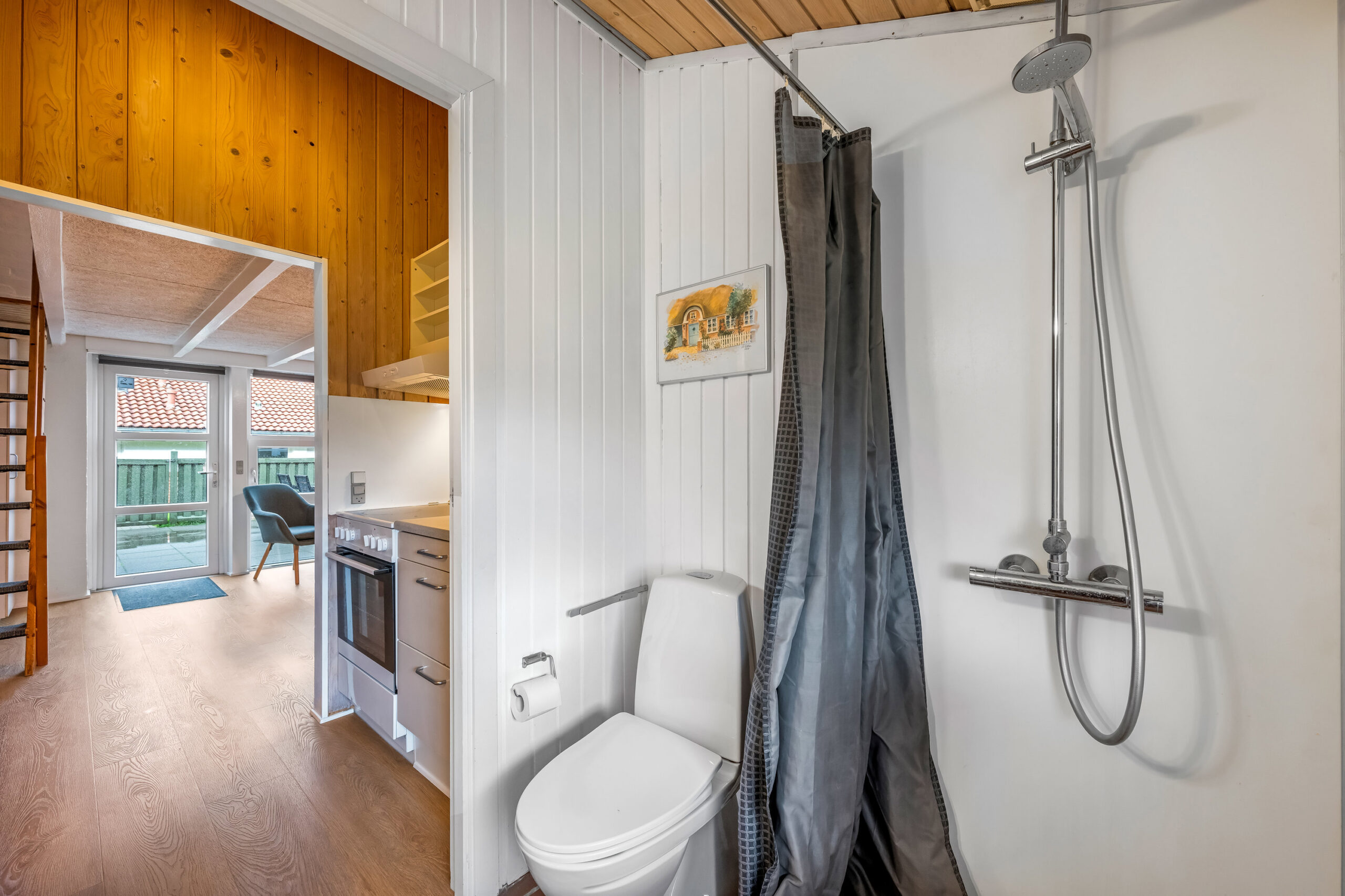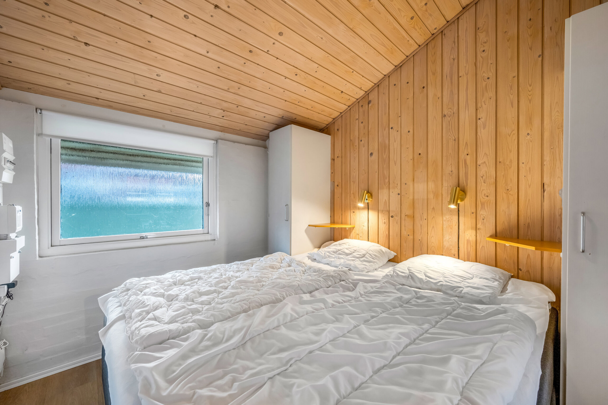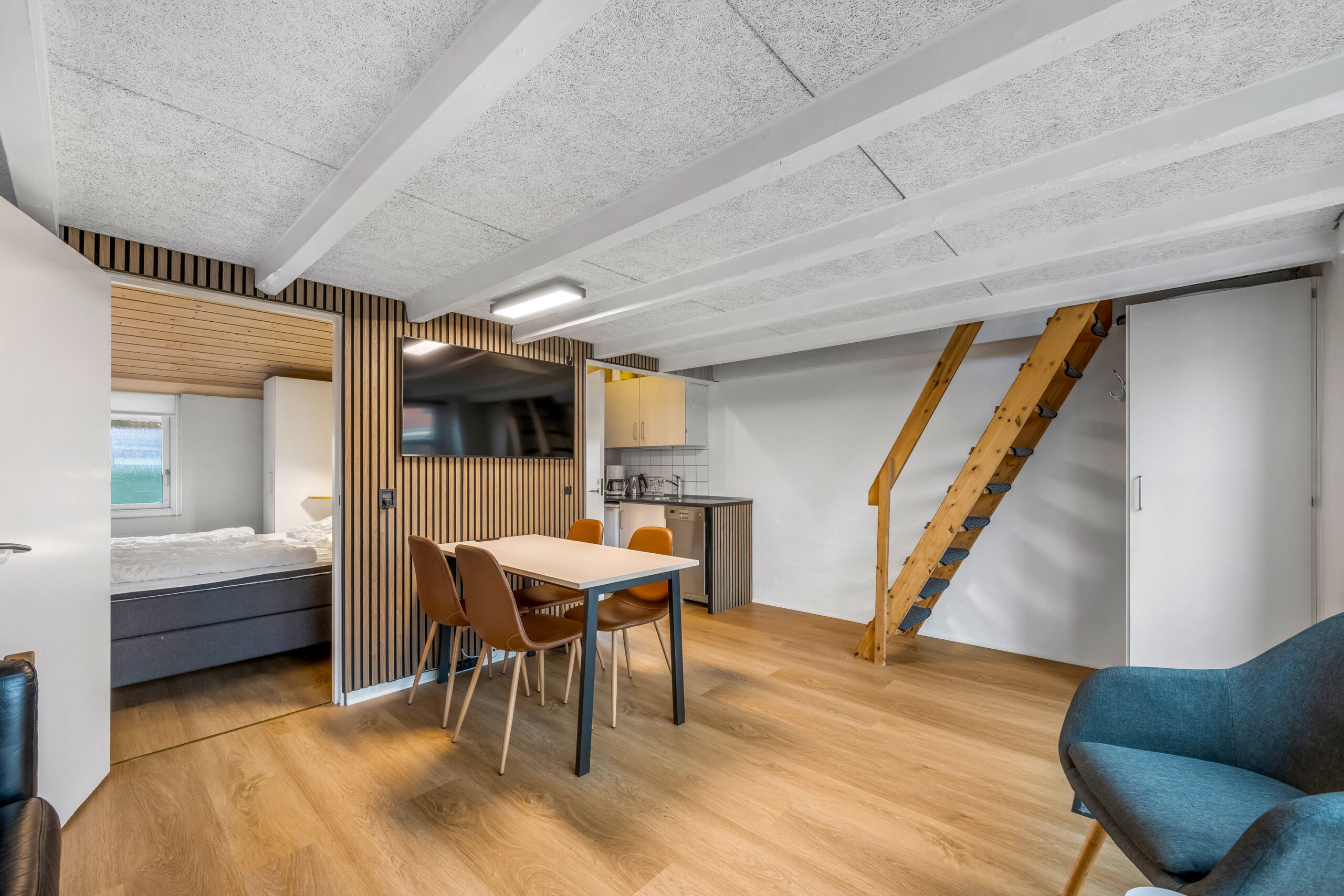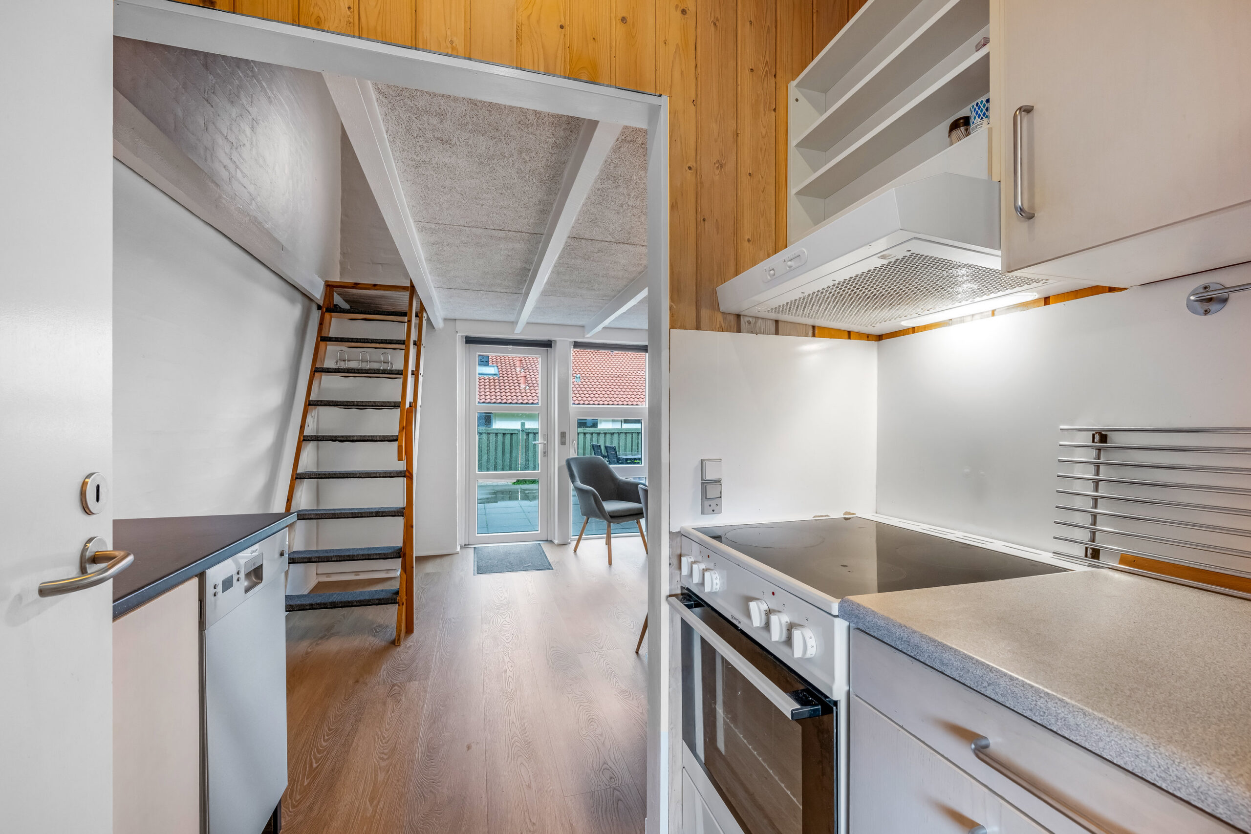 Lyse opholdsrum med store vinduespartier og direkte udgang til privat terrasse. Funktionelt køkken og spiseplads samlet i ét åbent rum, hvor ferien leves sammen. Soveværelser med varme trævægge og rolig atmosfære, der indbyder til afslapning. Praktisk badeværelse og en hyggelig hems med ekstra sovepladser. Udenfor venter solrig terrasse og grønne fællesarealer få skridt fra havn og fjord.