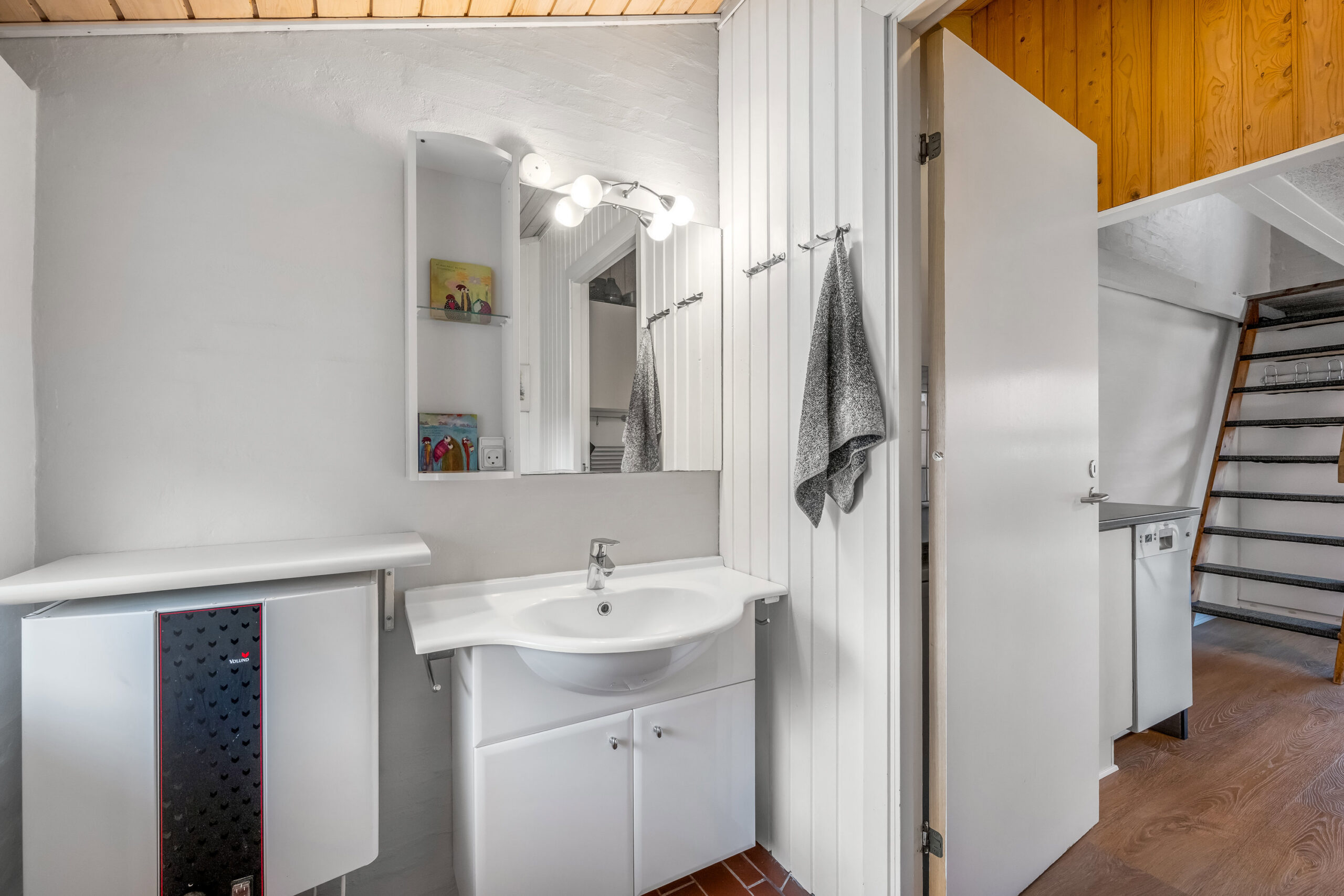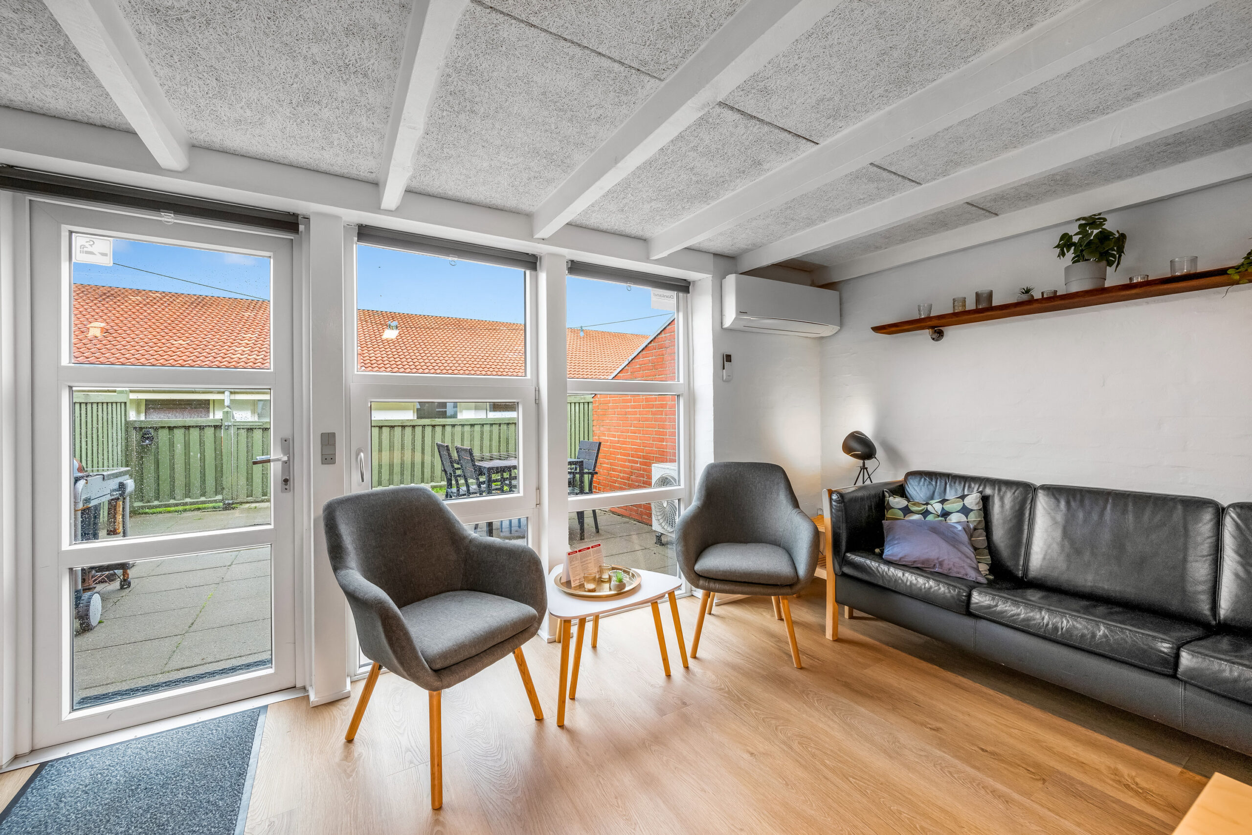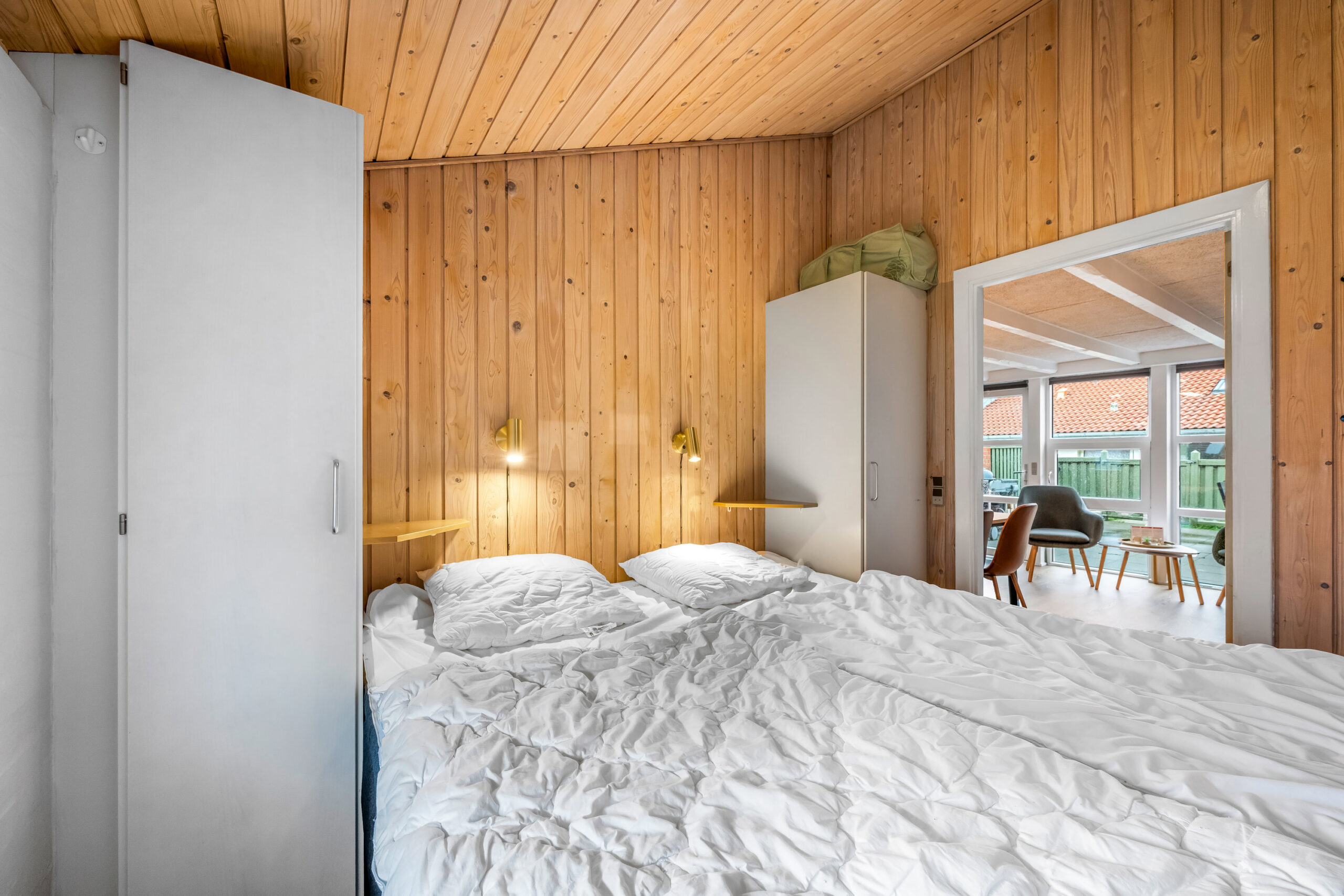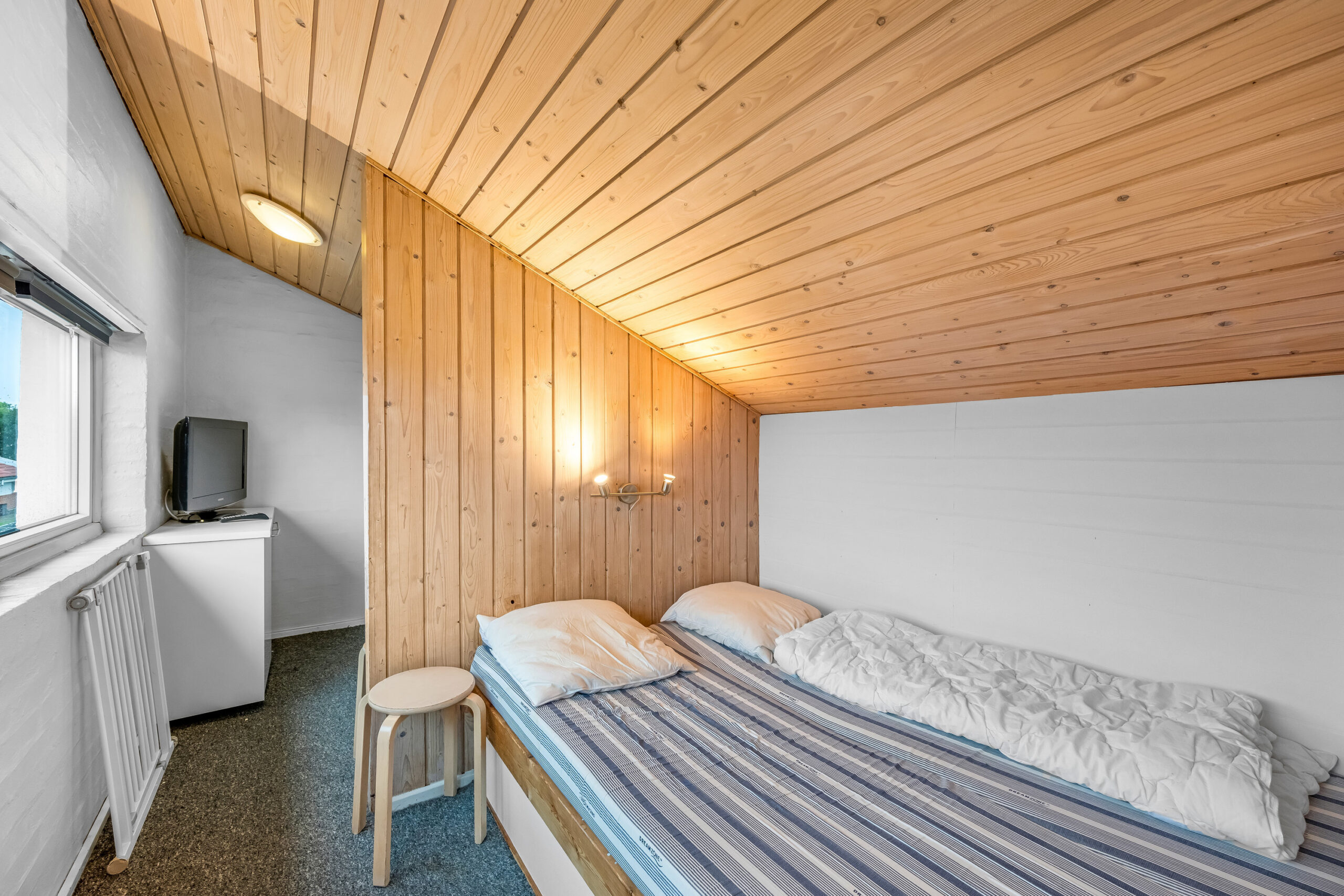 Lyse opholdsrum med store vinduespartier og direkte udgang til privat terrasse. Funktionelt køkken og spiseplads samlet i ét åbent rum, hvor ferien leves sammen. Soveværelser med varme trævægge og rolig atmosfære, der indbyder til afslapning. Praktisk badeværelse og en hyggelig hems med ekstra sovepladser. Udenfor venter solrig terrasse og grønne fællesarealer få skridt fra havn og fjord.
